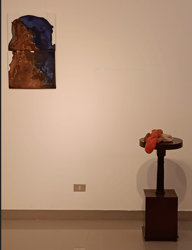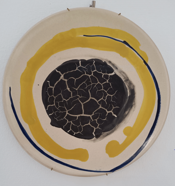In un allestimento in cui lo sguardo è invitato a spostarsi dal una parete all’altra della sala, a far da pendant al piatto di Busti troviamo quello di Marrocco. Docente di scultura ceramica all’Accademia di belle arti di Perugia il primo e di pittura, a Brera, il secondo, entrambi gli artisti sono presenti con opere a parete. Nell’opera di Marrocco è una metafora della fragilità a salire sul palco, uno strato di smalti volutamente fessurato che attrae la nostra attenzione, al centro dell’opera. Attorno, due semplici gesti di pennello in giallo e blu, segnano quasi un abbraccio, un voler sottolineare e allo stesso tempo proteggere la fragilità centrale. Il tutto, quindi, con una scelta cromatica squillante a fare da sfondo e a rendere ancora più evidente il contrasto nell’opera.