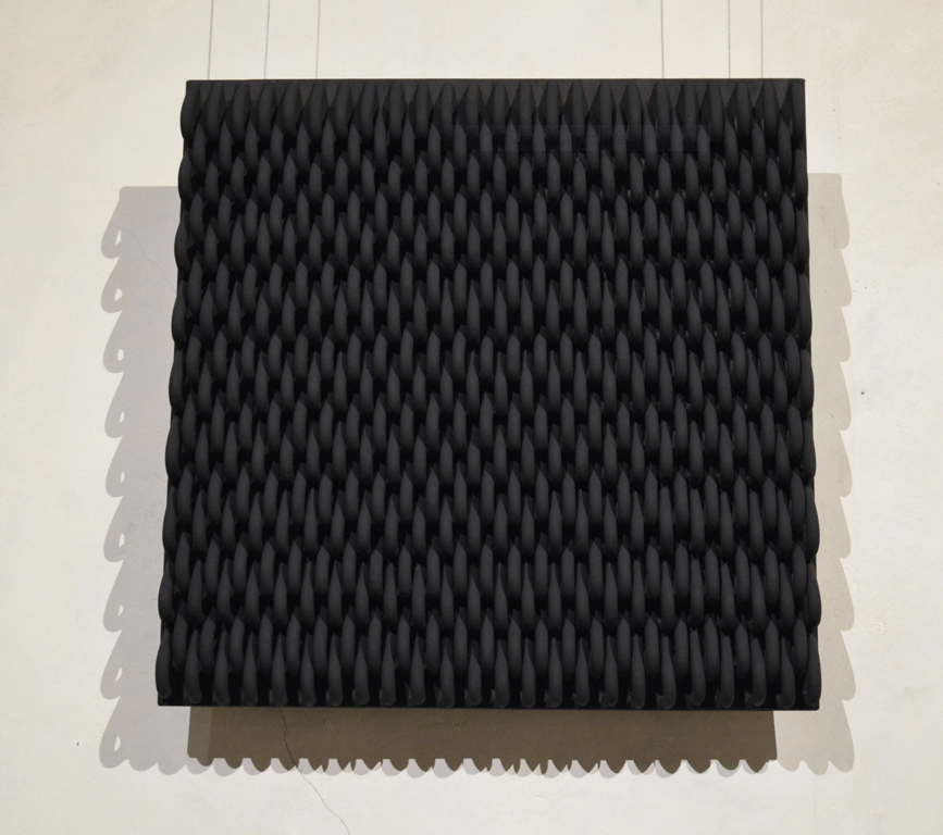 Tema, se non identico, decisamente molto simile è trattato da Helene Kirchmair. In un suo gruppo di opere, ad essere citata o utilizzata non è la porcellana in particolare ma tutta la ceramica, quella d’uso saremmo tentati di dire. Sono i manici che, sporgendo dal corpo del vaso, rischiano più spesso di rompersi, ma che in Velvet hug diventano elementi costitutivi di una nuova composizione. La disposizione ritmata di questi frammenti finisce infatti per comporre una texture che copre interamente il pannello a parete. Nonostante un nome diverso, è di nuovo l’attenzione alle superfici coperte da una fitta texture quella che ritroviamo in Rocket science blue e Rocket science white dove oggetti che sembrano rimandare a delle grandi anse sono supporto – quasi pretesto- per una tessitura che li copre interamente.