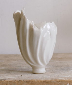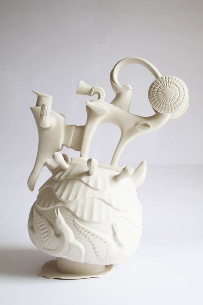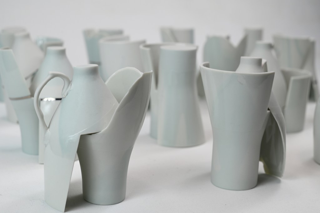 Così Pol Polloniato, da sempre attento alla sorte di manifatture venete del Settecento, quella degli Antonibon in particolare, sviluppa i suoi ormai celebri Pieni a rendere, stampi storici riempiti da scarti di produzione, un’opera già presente al sessantesimo concorso di Faenza ed ora esposta al MIC. Per questa esposizione abbiamo deciso però di presentare la tappa intermedia di questo percorso di ricerca e la sua prima sperimentazione in porcellana, un’installazione in cui il focus si sposta sulla manifattura belga della Royal Boch, oggetto di studio durante il soggiorno dell’artista a Bruxelles. Da stampi ormai in disuso della manifattura e destinati al macero, Pol costruisce degli ibridi che combinano le forme tradizionali in nuovi assemblaggi dalle forme articolate, opere a metà tra zoomorfe e fitomorfe in alcuni casi. Troviamo così citazioni delle minster jug inglesi di metà ‘800 – l’esemplare al V&A Museum di Londra è datato intorno al 1845 – o del grande vase au apôtres di Jean -Claude Zigler, dello stesso arco di anni, mescolati ad altri stilemi chiaramente decò e ad oggetti futuristi interpretati a suo tempo come parabole. Le forme antiche sono ormai intaccate da elementi e superfetazioni di epoche diverse, in forme meticce che hanno perso la loro identità per assumerne, al tempo stesso, una nuova.