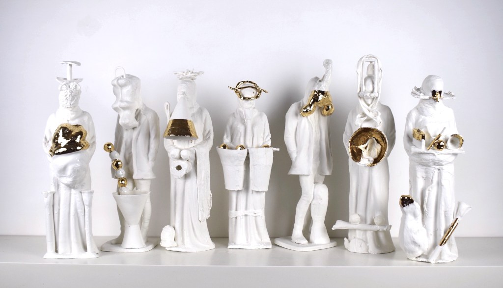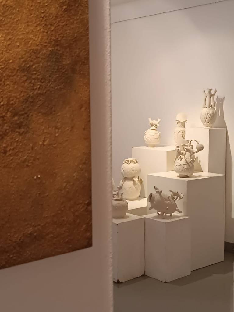 Spostando in poi lo sguardo all’estremità opposta della sala è il mondo affollato descrittoci da Paolo Porelli che torna sul tema delle nuove identità mutanti. Abbiamo visto l’opera di Pol rivolgersi alle tradizioni ceramiche, alla creazione dell’uomo. Ma lo stesso può dirsi di ciascuno di noi. Quanto siamo cambiati di anno in anno, quanto cambieremo ancora! Porelli rappresenta iconicamente questa trasformazione in una serie di sculture in porcellana dal titolo Golden Age. Se questo titolo può fare pensare ai più ad una passata età dell’oro, le sculture invece ci trasportano in un mondo futuro, non sappiamo quanto lontano da noi, in cui tutti noi porteremo tracce evidenti della nostra evoluzione. Anche qui, come nelle creazioni di Polloniato, protomi e appendici alterano la struttura originaria dei nostri corpi per vite nuove che, chissà, si affacciano in tempi futuri. Ma la resilienza e la capacità umana di adattarsi alle situazioni più diverse è una possibile risposta alle difficoltà che ci circondano, fino a trasformare noi tutti in qualcosa di nuovo, di inaspettato, una novità che sembra trasparire anche esternamente in queste figure ibride di Porelli realizzate in occasione di una residenza a Jingdezhen, in Cina.