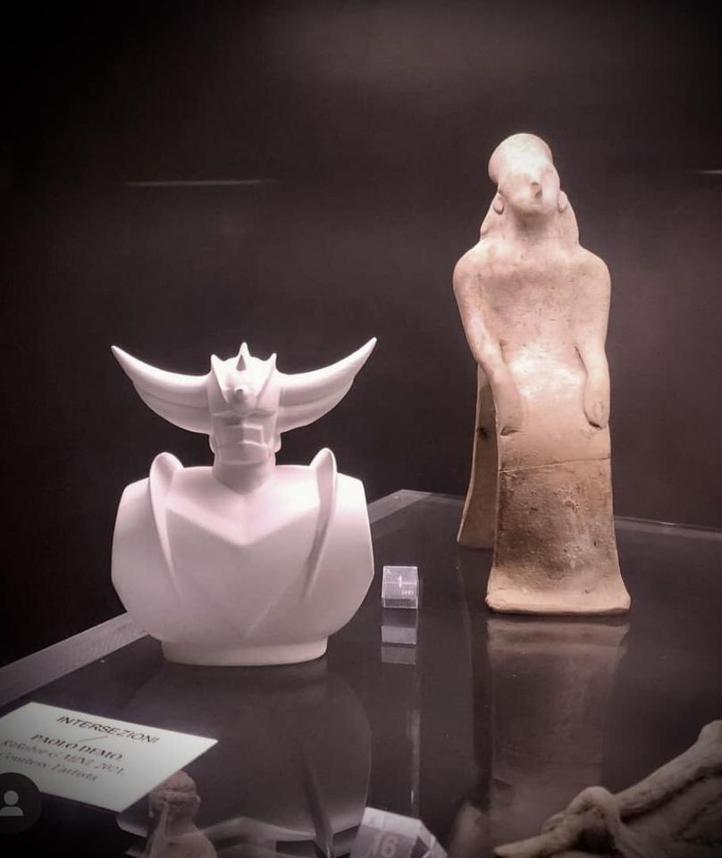 Stesa leggera ironia nei piccoli “ex voto” di Paolo Demo, in cui all’argilla antica si affiancano robot dai colori industriali spiazzanti, dal bianco lucido al rosa acceso.