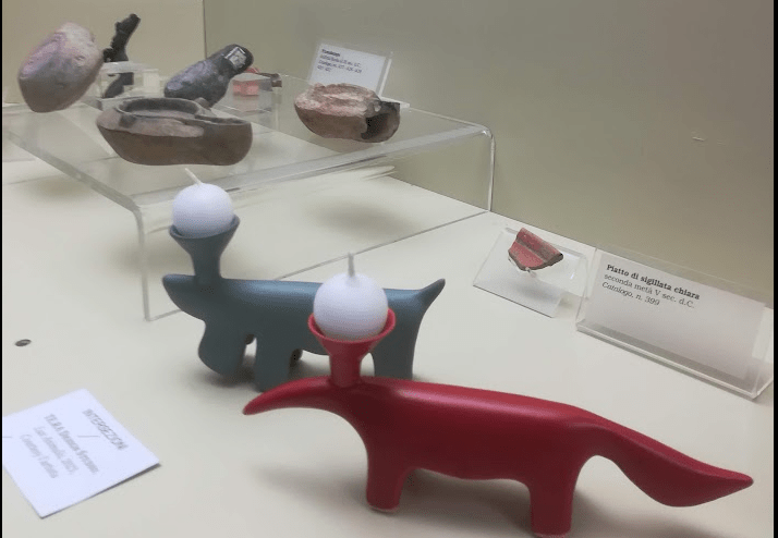 Ci appoggiamo quindi, in prima battuta, alle riflessioni di Marcella Anglani riportate nel catalogo della storica mostra Arte torna arte del 2012. Commentando opere contemporanee di indiscusso valore presentate nella Galleria dell’accademia di Firenze, la studiosa individuava numerosi possibili agganci tra antico e riletture o citazioni moderne. Queste spaziavano dal riconoscimento del valore storico condivido, alla loro canonizzazione, potremmo quasi dire, fino ad arrivare all’irrisione e alla dissacrazione iconoclasta. Parlando quindi alla mostra che presentiamo oggi come non citare, al riguardo, il voluto anacronismo presente nelle opere di TE. RA. design studio, in cui le lucerne romane sono affiancate ad altre sculture plastiche a forma di bassotto o formichieri, animali sconosciuti al momento della realizzazione delle opere citate?
