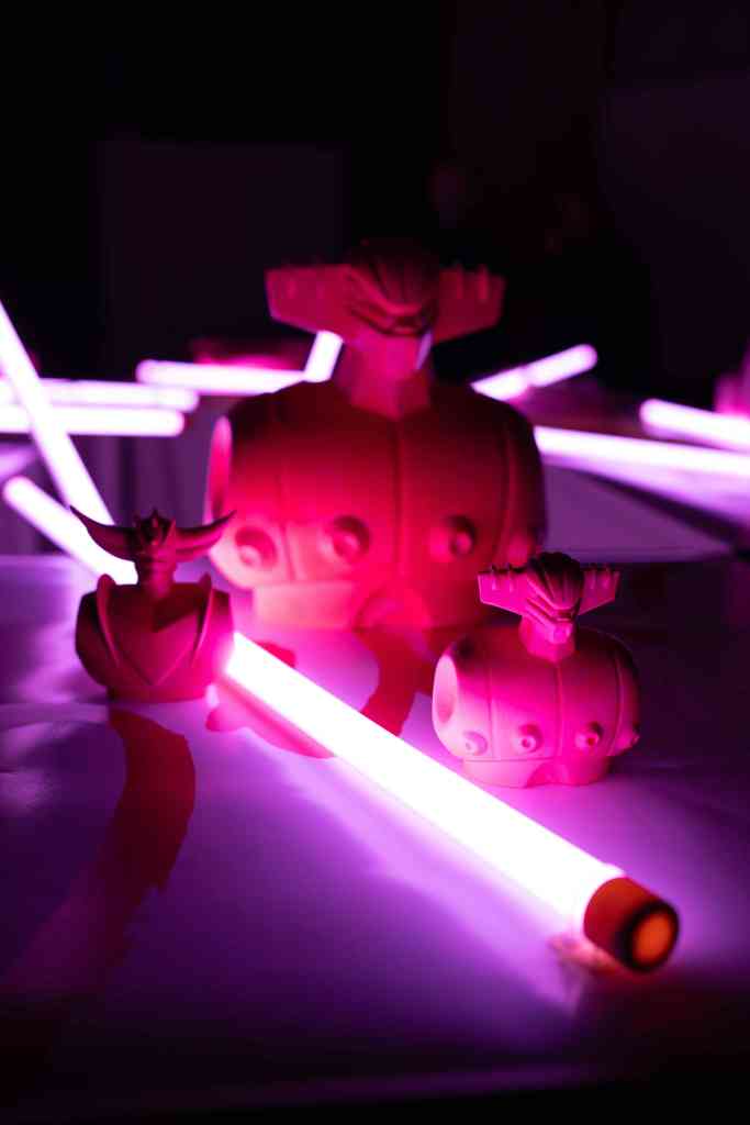 Passando velocemente oltre è facile individuare, nei busti di bianco marmoreo, un rimando alle opere ben più antiche, siano esse i busti classici o la proposizione neoclassica ad opera delle diverse manifatture tra cui quella Ginori di Doccia di cui abbiamo uno splendido esempio attualmente esposto al MART di Rovereto. Qui l’espediente che ci strappa il sorriso è la scelta dei personaggi rappresentati: Jeeg robot e Goldrake.