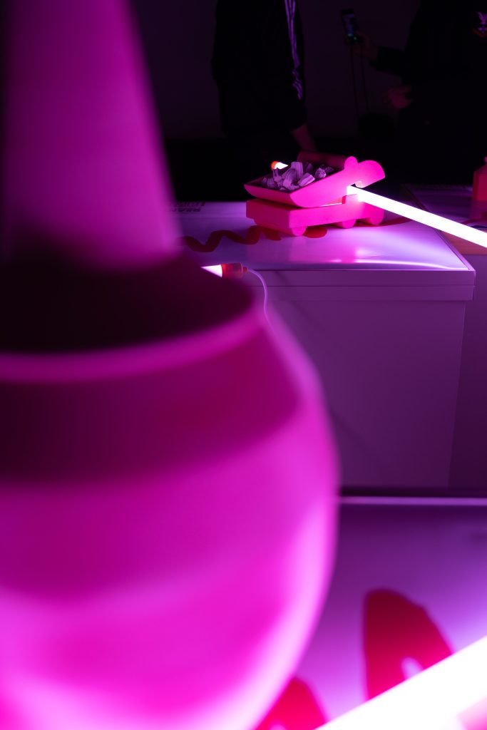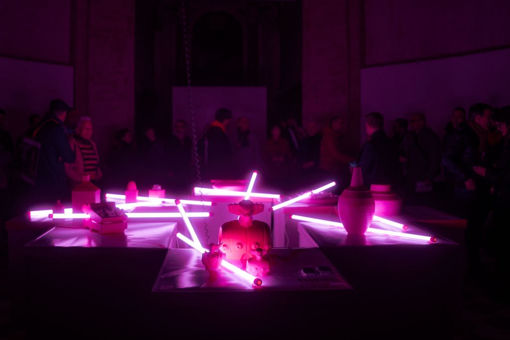 Quelle che seguono sono le parole di quanti hanno seguito il progetto, un racconto a più voci in cui si susseguono il testo di chi scrive, un focus sulla ricerca recente – quasi una accelerazione in direzione pop con la scelta del rosa fluo come colore unificante delle opere e dello spazio espositivo – e alcune riflessioni dell’artista che, in quanto architetto di formazione, si sofferma sul rapporto tra oggetti e spazio architettonico circonstante, sul loro dialogo reciproco.